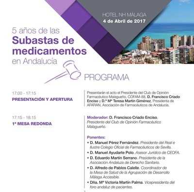 El jueves 4 de abril tuvo lugar la jornada «5 años de las Subastas de Medicamentos en Andalucía», organizada por AFARAN (Asociación de Farmacéuticos de Andalucía» y el Clup de Opinión Farmacéutico Malagueño, que se celebró en el Hotel NH Málaga, y donde la Presidenta de APAM, en calidad de Vicepresidenta del Foro Andaluz de Pacientes, participó como ponente poniendo de manifiesto la problemática de los daños colaterales que pueden generar los medicamentos genéricos de subasta en pacientes crónicos y polimedicados como nosotros. En este acto estuvieron presentes representantes políticos de todos los partidos, a los que se les pidió su colaboración para llegar a un concenso y solucionar este tema que nos afecta a todos.